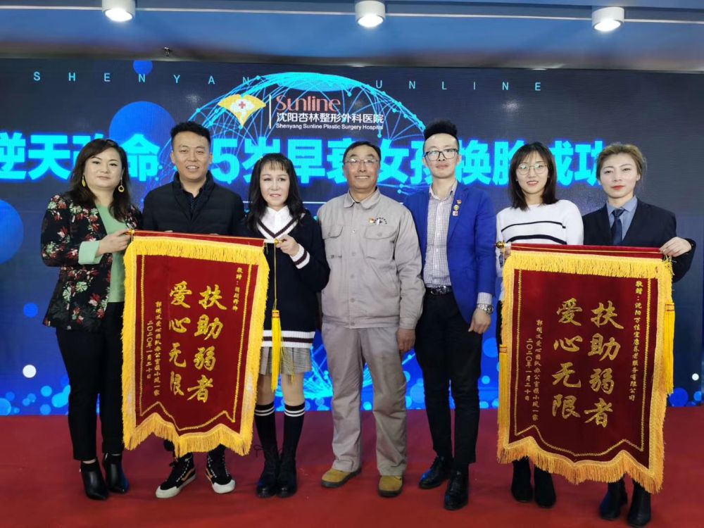 小凤(左三)与郭明义以及医疗救助人员合影。(沈阳杏林整形外科医院供图)