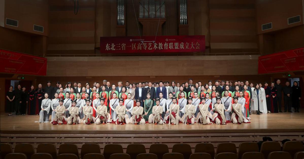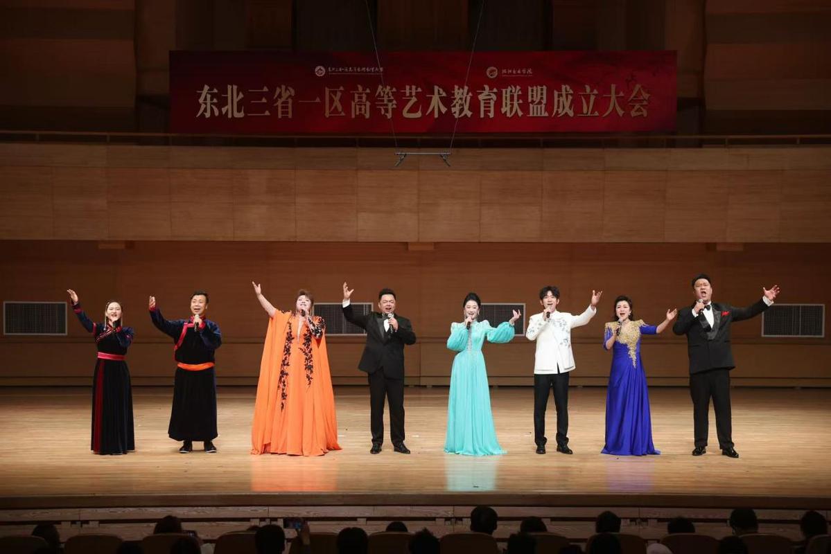 成立大会结束后,东北三省一区高等艺术院校音乐舞蹈专场音乐会随即精彩上演。音乐会汇聚辽宁、吉林、黑龙江三省与内蒙古自治区的高等艺术院校创作演出的精品力作,以多样的艺术形式展现浓郁地域风情。哈尔滨音乐学院以气势磅礴的吹打乐《天地人和》拉开序幕,充分彰显民族音乐热烈的艺术张力;大连艺术学院演出的东北民歌联唱唤起共同的地域文化记忆;吉林大学艺术学院演出的单簧管独奏《月儿明,风儿静》展现出一幅北国家园的夜色素描;吉林艺术学院演出的舞蹈《凇》以古典剑舞的创新形式演绎北国雾凇意境;内蒙古艺术学院演出的乐团合奏《草原图腾》旋律奔放、节奏铿锵,尽显草原文化特色;与沈阳音乐学院合作演出的《情歌》则深情抒发家国情怀与民族大义。渤海大学音乐学院、辽宁大学艺术学院、东北大学艺术学院、大连大学音乐学院、辽宁师范大学音乐学院、沈阳师范大学音乐学院陆续演出了《爱永在》《舟中晓望》《天路》《长海笙歌》《海恋》《看秧歌》等节目,演出融合非遗元素与现代语汇,共同绘就出一幅多元交融、绚丽动人的文化画卷。沈阳音乐学院接连呈现《乌苏里船歌》《阿里郎组曲》《丢戒指》《父亲的草原母亲的河》等经典作品,生动刻画东北与多民族生活图景;中国古典舞《散乐图》再现辽代乐舞风貌,彰显中华民族多元融合的文化底蕴。音乐会在参演高校共同演唱的《哦,我的大东北》饱含深情的歌声中达到高潮,随后全体演员与观众共同演唱《我和我的祖国》,在温暖感人的氛围中,音乐会圆满落幕。整场演出主题鲜明、形式丰富,既是东北地域艺术教育成果的一次集中展示,也奏响了东北三省一区携手奋进、共谱文化新篇的动人乐章。