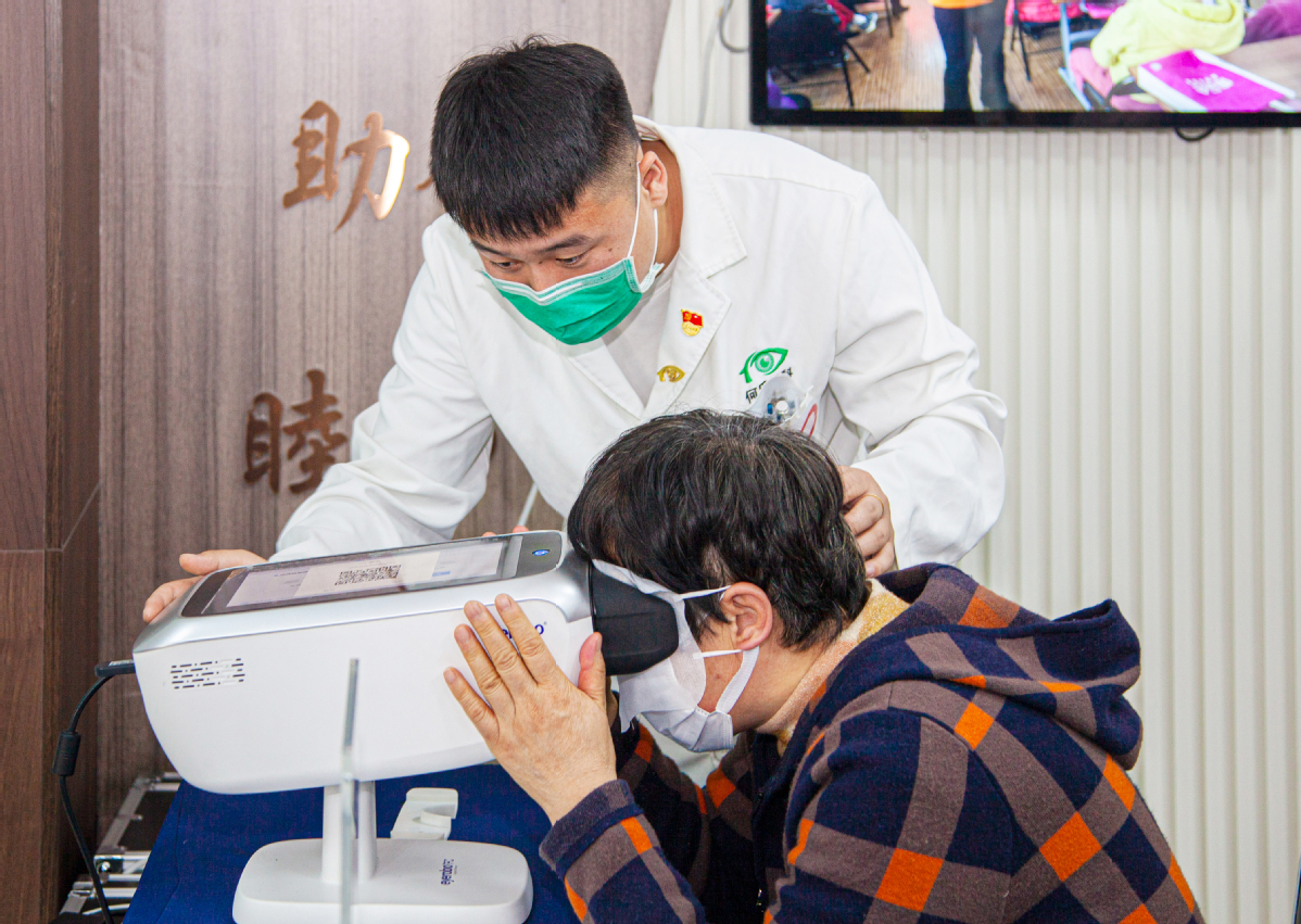 图说:何氏眼科医生通过“光明小屋”内的智能设备为居民做眼健康检查